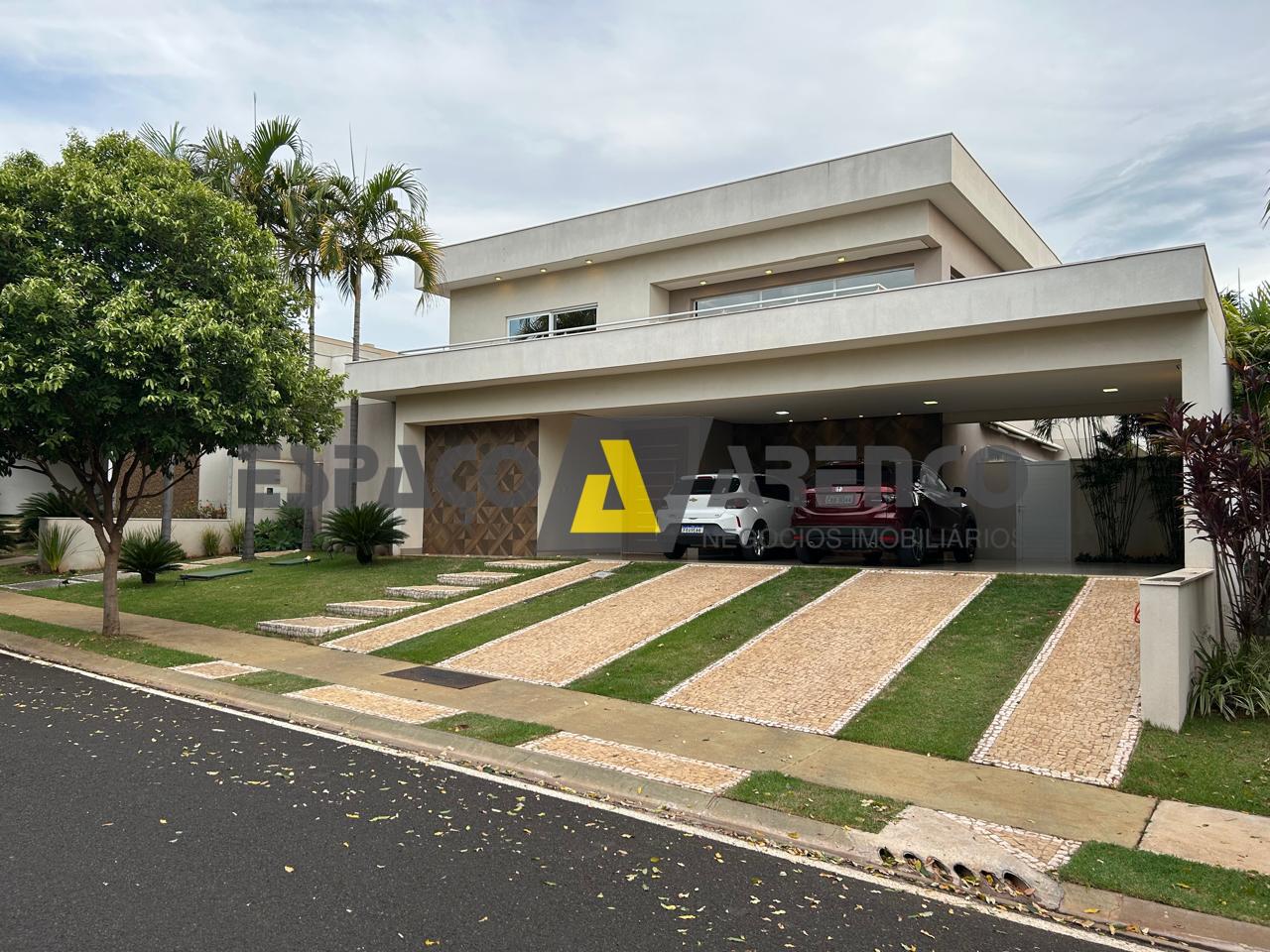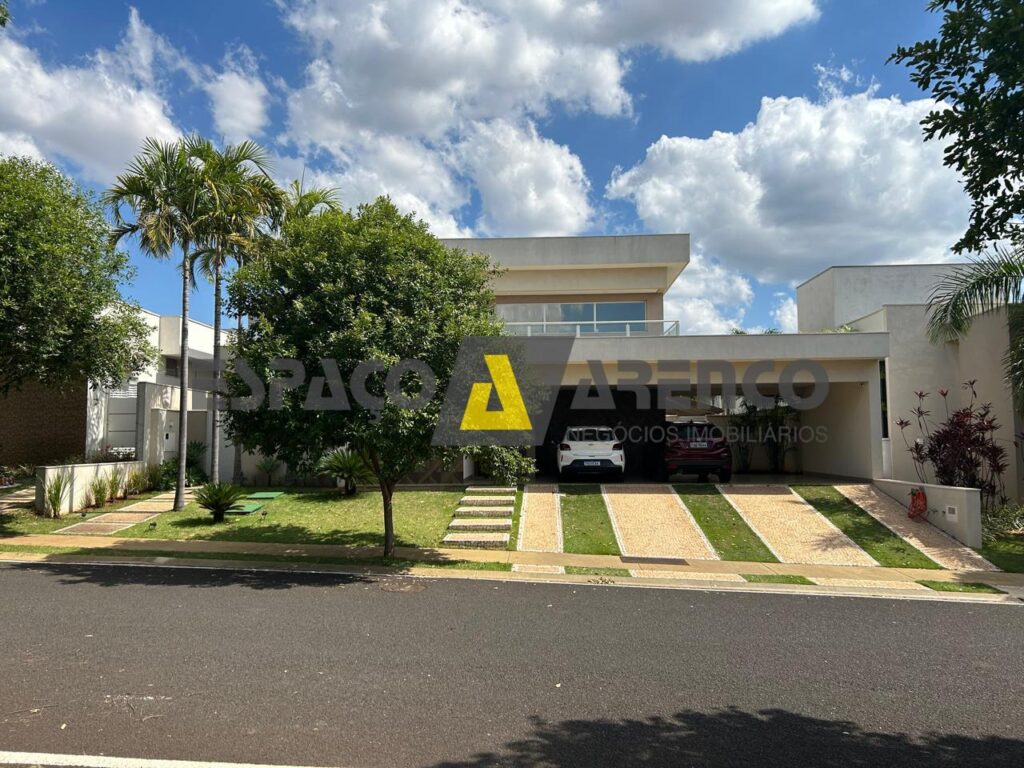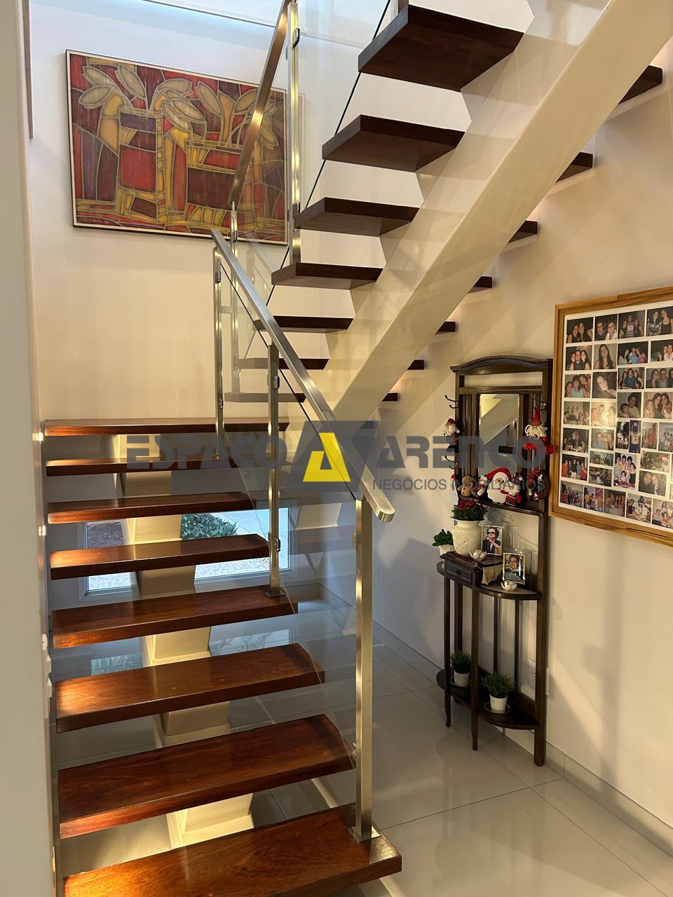 Sobrado com 3 suítes, sendo uma suíte master com closet e banho duplo, todas completas com móveis planejados e climatização. Sala ampla com pé-direito duplo e persiana elétrica, proporcionando sofisticação e iluminação natural.