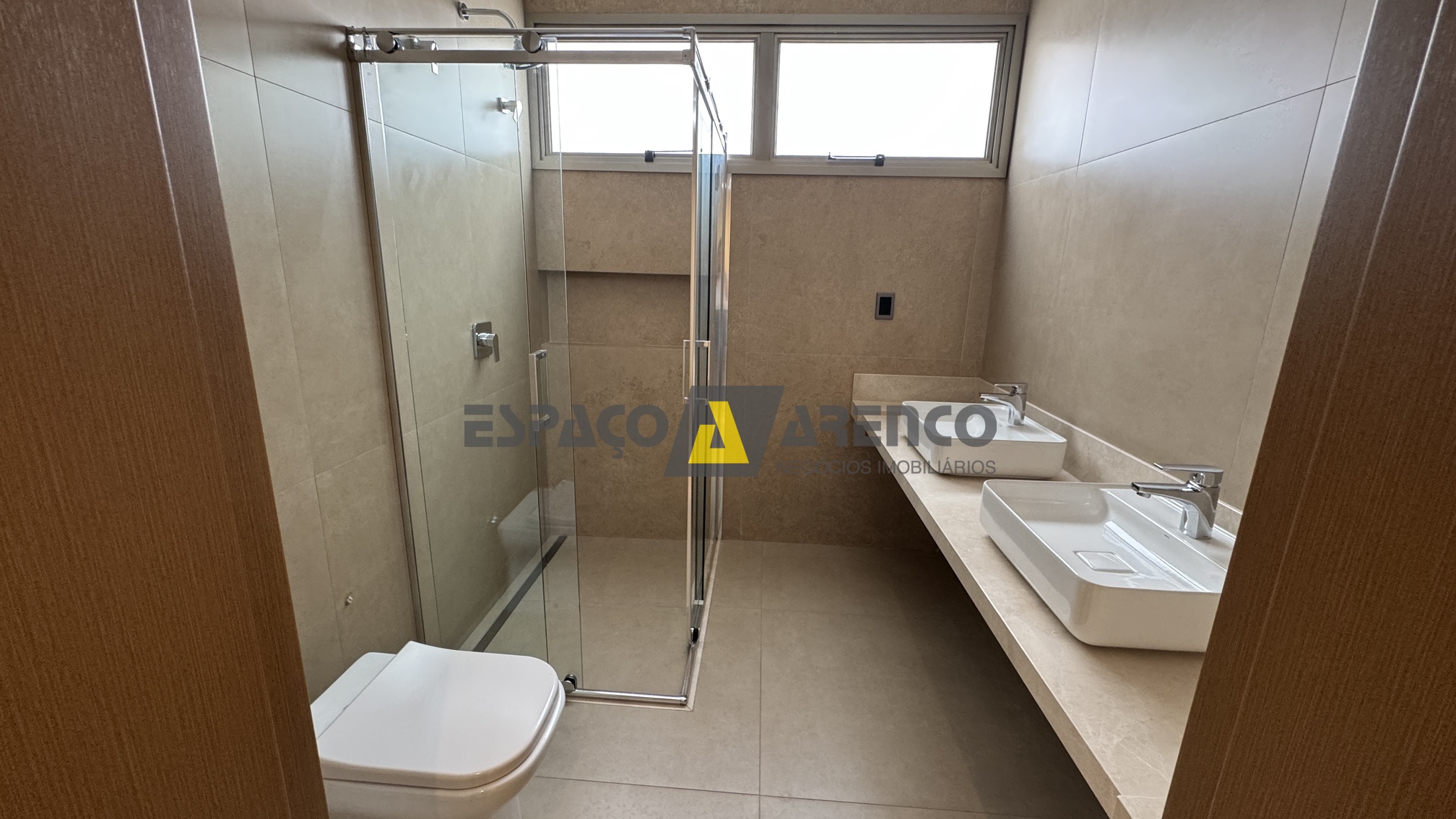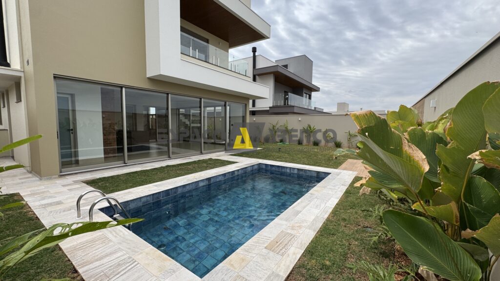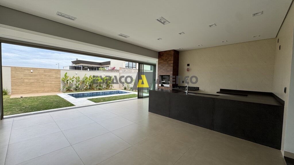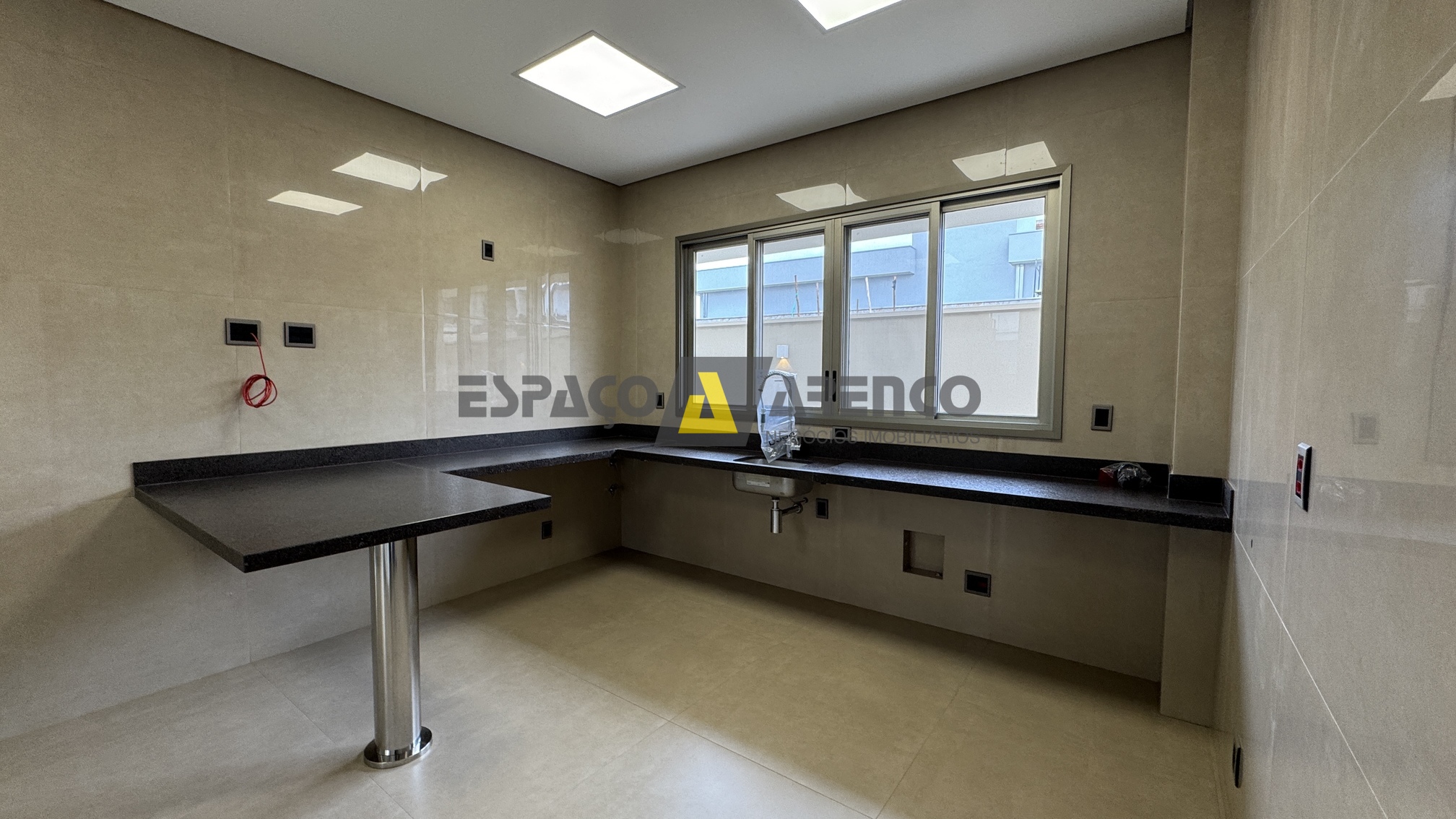 Térreo, sala ampla para ambientes de estar, tv e jantar, escritório, banheiro, cozinha com bancada de granito, dispensa, área de serviços, espaço gourmet, banheiro, piscina com aquecimento solar, quintal com paisagismo e iluminação, quarto de despejo, garagem coberta para 03 autos e mais três descobertos.